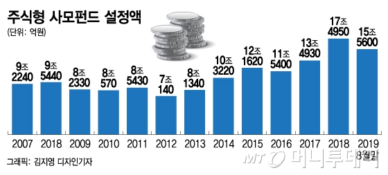 주식형 사모펀드 시장도 최근 들어 성장세가 꺾였다. 지난 8월말 주식형 사모펀드 설정잔액은 15조5600억원으로 올 들어 월말 기준으로 가장 낮은 수준이다. 지난 6월 말(16조4800억원) 이후 두달 연속 감소세다. 지난해 말(17조4950억원) 대비 1조9350억원(11%) 줄었다.
