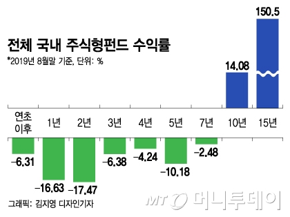 한국펀드평가에 따르면 지난 8월말 기준 국내 주식형 공모펀드는 연 수익률이 마이너스(-)16.6% 수준까지 떨어졌다. 3년 수익률은 -6.38%, 5년 수익률은 -10% 초반대다.