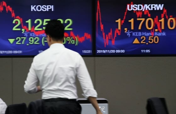 코스피지수가 미중 무역협상의 불확실성으로 2120선까지 밀렸다. 증권업계는 도널트 트럼프 미국 대통령의 '홍콩인권법' 통과 여부와 미중 무역협상의 방향성을 확인한 후에 대응할 것을 권했다. 단기적으로 연말 배당주 매력이 있는 은행주와 유틸리티주를 추천했다.
