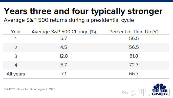 26일(현지시간) 미국 시장조사업체 베스포크투자그룹에 따르면 1928년 이후 역대 미국 대통령들의 집권 4년차 S&P(스탠더드앤드푸어스) 500 지수 상승률은 5.7%였다.