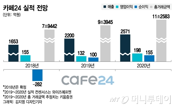 반면 카페24는 국내 전자상거래 시장 지배력 강화 및 해외 시장 진출 등으로 꾸준히 외형을 불리고 있다. 투자 정보 제공 업체 와이즈에프엔에 따르면 카페24의 올해 매출액 컨센서스는 2200억원으로 전년 대비 약 33% 증가할 것으로 예상된다.