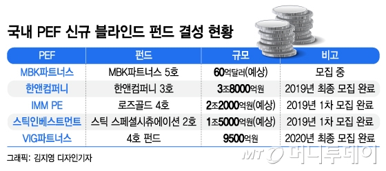 어느새 조단위 대형 블라인드 펀드가 수두룩하다. 각 PEF(사모펀드) 운용사마다 최대 규모 신규 펀드 조성이라는 성과를 내고 있다. 블라인드 펀드 투자 집행 시기와 맞물려 국내 M&A(인수합병) 시장에서 자금력을 앞세운 PEF의 활약이 더욱 커질 것으로 관측된다.
