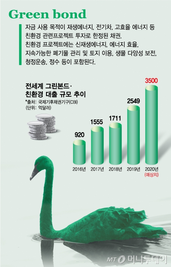 국제기후채권기구(CBI)에 따르면 지난해 그린본드를 포함한 친환경 채권 및 대출 규모는 2549억달러(약 299조7624억원)에 달했다. CBI의 예상치인 2300억~2500억달러(270조4800억~294조원)를 웃돈 것이다. 올해는 3500억~4000억달러(411조6000억~470조4000억원)로 시장이 커질 전망이다. 2021~2022년에는 시장 규모가 1조 달러(1176조원)를 넘을 것으로 예상된다. (이미지 요청 예정)