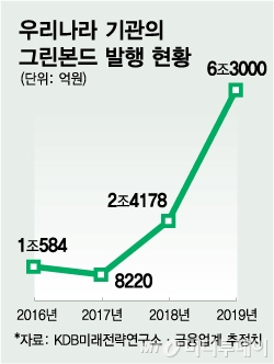 31일 KDB미래전략연구소와 금융업계에 따르면 우리나라 기관이 발행한 그린본드 규모는 2016년 1조584억원에서 2018년 2조4178억원으로 두 배 이상 성장했다. 지난해에는 약 6조3000억원으로 전년보다 2.6배 급성장했다. ((관련 이미지 요청))