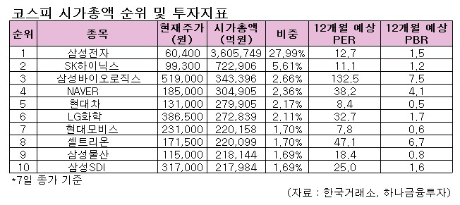 지난 5일 종가 기준삼성전자(186,200원 ▲7,800 +4.37%)시가총액은 360조5749억원에 달했다. 코스피 전체 시총의 28%다.SK하이닉스(876,000원 ▲46,000 +5.54%)시총도 72조2906억원으로 3위인삼성바이오로직스(1,554,000원 ▼31,000 -1.96%)(34조3396억원)보다 두 배 이상 많았다. 이재만 하나금융투자 연구원은 "과거 업황에 따라 국내 증시 시총 2위 자리가 바뀌적도 있지만, SK하이닉스 시총은 3위 그룹과 무려 두 배 이상 차이가 난다"며 "'기술 시대'가 끝나지 않는 한 이 순위는 바뀌지 않을 것"이라고 말했다.
