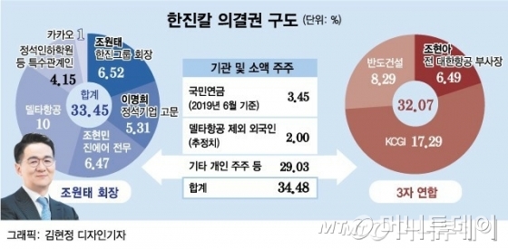 이는 조 전 부사장이 빠진 조 회장 일가 지분(22.45%)에 조 회장의 백기사로 여겨지는 미국 델타항공(10%) 및 카카오(1%) 등을 더한 33.45%와 비등해 오는 3월 주주총회에서 빠듯한 표 대결이 예상된다. KCGI는 현재 한진칼에 △전문경영인 선임 △이사회 독립성 제고 △전자투표제 도입 등 주주제안을 한 상태다.