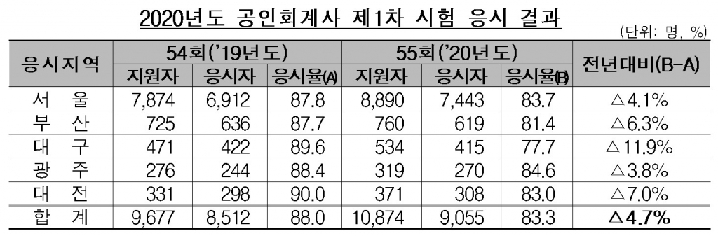 24일 금융감독원에 따르면 지난 23일 전국 7개 대학에서 치러진 제55회 공인회계사 1차 시험 응시율은 지난해보다 4.7%포인트 내린 83.3%로 잠정 집계됐다.