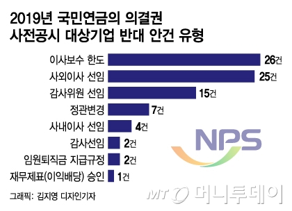 지난해 국민연금이 의결권을 사전공개한 기업 96곳 중 코스피 기업이 89곳으로 이 가운데 40개 기업 82개 안건에 대해 반대 의사를 표시했다. 이사의 보수 한도에 대한 반대가 26건으로 가장 많았고 △사외이사 선임 25건 △감사위원 선임 15건 △정관변경 7건 △사내이사 선임 4건 등으로 그 뒤를 이었다.