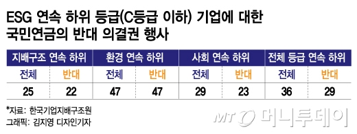 국민연금의 경우 기업지배구조원이 산정한 ESG 등급이 낮을수록 반대할 확률이 높았다. 특히 지배구조 부문에서 2년 연속 C등급 이하를 받은 기업들은 25곳 중 22곳이 국민연금의 반대를 받았다. 환경 부문에서 2년 연속 저조했던 기업 47곳에는 모두 반대했다.