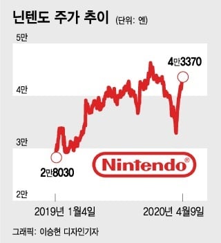 9일 오전 11시 기준 도쿄증권거래소에서 닌텐도 주가는 전일 대비 220엔(0.5%) 하락한 4만3370엔에 거래 중이다. 닌텐도 주가 역시 코로나19로 인한 글로벌 증시 충격의 여파로 올 들어 25% 급락했지만 지난달 26일 3만2950엔으로 저점을 찍은 이후 반등해 현재는 저점 대비 30% 이상 오른 상태다. 52주 신고가(2019년 12월10일 4만7000엔)에도 거의 근접했다.