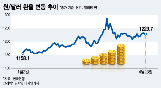그런데 외국인들의 매도세가 연일 지속되고 있는데도 원달러 환율은 큰 변동이 보이지 않고 있다. 4월 1일 원달러 환율은 1230.5원(종가 기준)이었는데 23일 현재 1229.7원(종가 기준)으로 환율은 거의 제자리를 유지하고 있다. 오히려 지난 14일에는 환율은 1217.3원까지 하락하기도 했다.