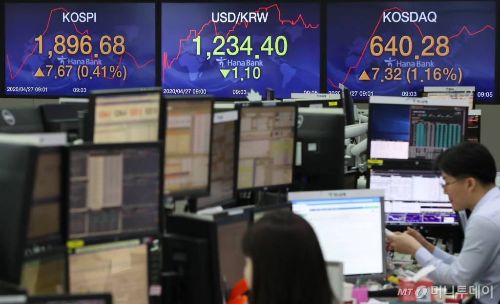 ![[서울=뉴시스] 조수정 기자 = 27일 코스피가 전 거래일 대비 8.05p(0.43%) 오른 1897.06으로 출발했다. 코스닥은 5.94p(0.93%) 오른 638.90으로 거래를 시작했다. 이날 서울 외환시장에서 원달러 환율은 3.0원 내린 1232.5원에 개장했다. 27일 오전 서울 하나은행 딜링룸에서 딜러들이 업무를 보고 있다. 2020.04.27. chocrystal@newsis.com](https://thumb.mt.co.kr/cdn-cgi/image/f=avif/21/2020/04/2020042715365990177_1.jpg)