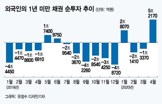외국인의 단기채 매입이 급증한 건 지난 3월 정부가 발표한 선물환 포지션 규제 완화 때문이라는 분석도 나온다.