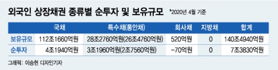 13일 금융감독원에 따르면 지난 4월 외국인의 국내 채권 보유잔고는 140조4940억원으로 역대 최대 규모를 기록했다. 외국인은 4월 한달 동안 9조3210억원을 순매수하고 1조9380억원을 만기 상환해 총 7조3830억원을 순투자했다. 3월 들어 순투자가 크게 늘었다.