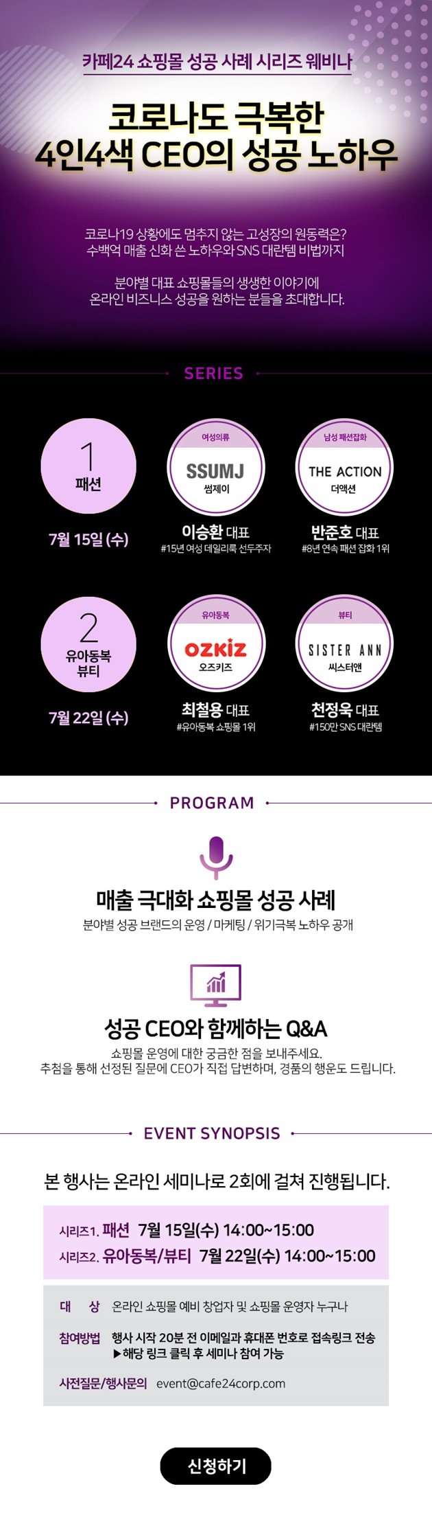 카페24 온라인 세미나에는 패션, 뷰티 등 분야의 온라인 쇼핑몰 CEO(최고경영자)가 강연에 나선다. 여성 의류 쇼핑몰 '썸제이'의 이승환 대표와 남성 패션 잡화 쇼핑몰 '더액션'의 반준호 대표가 오는 15일 세미나에서 발표한다. 오는 22일에는 아동복 쇼핑몰 '오즈키즈'의 최철용 대표와 뷰티 쇼핑몰 '씨스터앤'의 천정욱 대표가 강연한다.