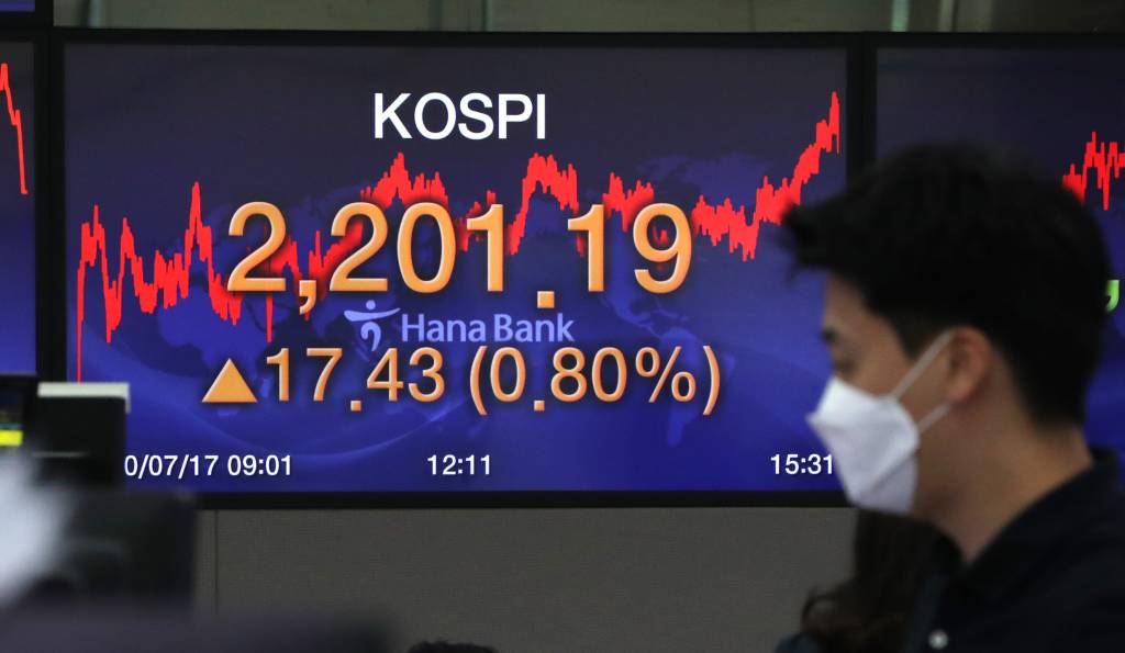 ![[서울=뉴시스]전진환 기자 = 코스피가 미국의 경기 부양책 기대감에 상승 마감한 17일 오후 서울 중구 명동 하나은행 딜링룸 모니터에 지수가 전 거래일 대비 17.43(0.80%)p 오른 2,201.19를 나타내고 있다. 2020.07.17. amin2@newsis.com](https://thumb.mt.co.kr/cdn-cgi/image/f=avif/21/2020/07/2020071716264071485_1.jpg)