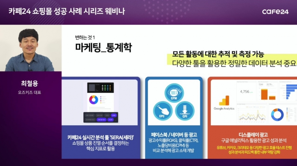 아동복 쇼핑몰 '오즈키즈'의 최철용 대표는 인문학적 콘텐츠 기획과 통계 기반 마케팅 사이의 균형을 강조했다. 최 대표는 "제품의 특장점을 나열하는 것보다 공감과 재미를 줄 수 있는 공감 콘텐츠 마케팅을 펼치는 것이 중요하다"며 "막연한 직감에 의존하는 것보다 카페24에서 제공하는 세라(SERA, 실시간 빅데이터 분석 서비스)로 소비자 패턴을 정확하게 이해한다면 성공의 실마리를 찾을 수 있을 것이라고 말했다.