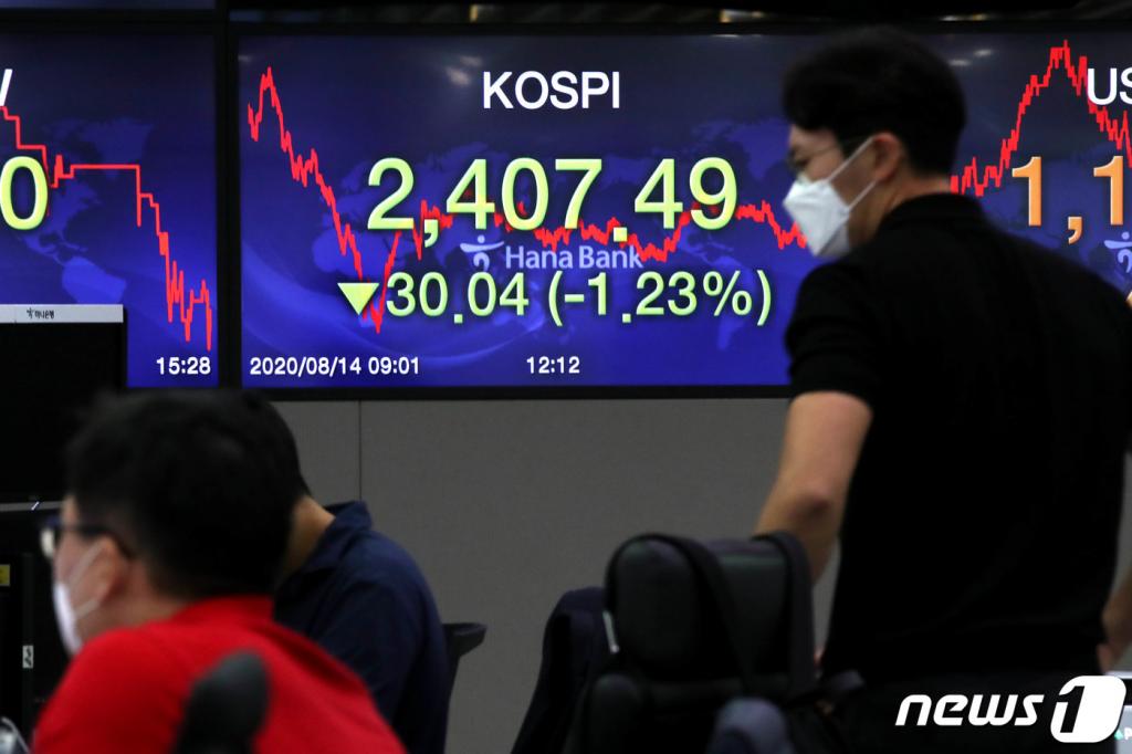 ![[서울=뉴시스] 박미소 기자 = 코스닥지수는 전 거래일보다 19.74포인트(2.31%) 내린 835.03에 마감한 14일 오후 서울 중구 하나은행 딜링룸에서 직원들이 업무를 보고 있다. 이날 코스피 지수는 전 거래일(2437.53)보다 30.04포인트(1.23%) 내린 2407.49에, 서울 외환시장에서 원·달러 환율은 전 거래일(1183.3원)보다 1.3원 오른 1184.6원에 마감했다. 2020.08.14. misocamera@newsis.com](https://thumb.mt.co.kr/cdn-cgi/image/f=avif/21/2020/08/2020081415010844888_2.jpg)