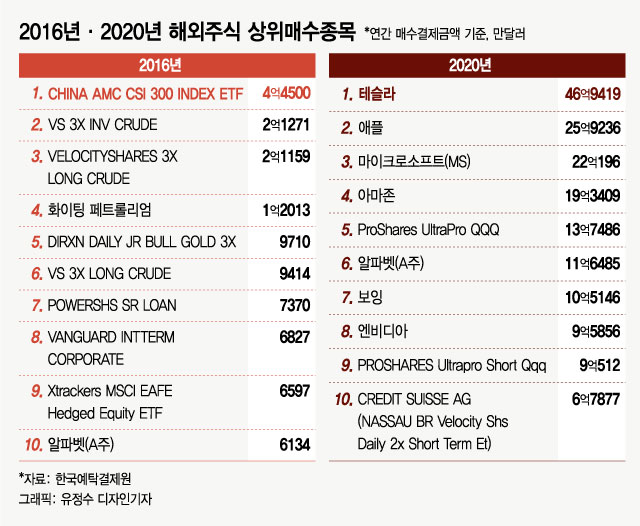 20일 한국예탁결제원에 따르면 올해 들어 국내 투자자들이 가장 많이 매수한 10개 종목 중에는 개별주식이 7개, 레버리지 ETF·ETN 상품이 3개 포함됐다. 2016년 상위 10개 종목에 비해 매수 규모가 12배 넘게 늘었다.