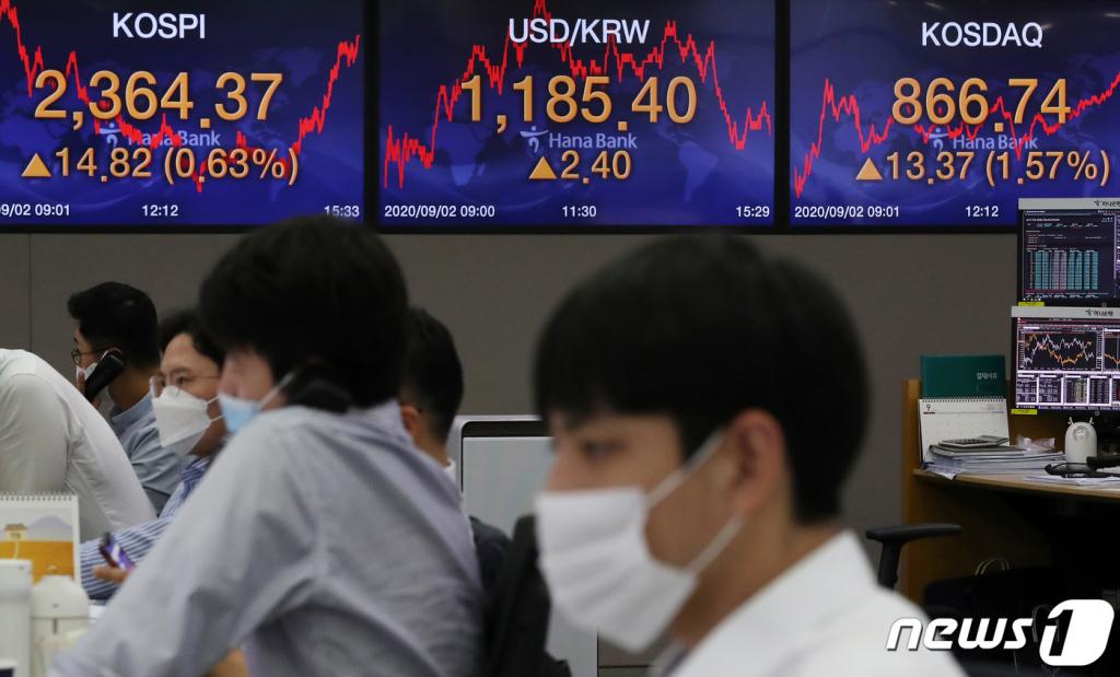 2일 코스피는 14.82포인트(0.63%) 오른 2364.37로 마감했다. 전날 강세를 보인 미국 증시 영향으로 0.59% 상승하며 출발했다. 오후 들어 외국인 순매도폭이 확대되면서 하락 전환했다가 오후 2시 30분을 전후로 장 초반 수준을 회복했다.