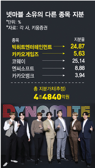 최근 넷마블의 주가 상승은 다소 아이러니하다. 본업이 아닌 투자가치가 동력이다. 넷마블은 카카오게임즈와 빅히트엔터테인먼트의 지분을 각각 5.63%, 24.87% 들고 있다.