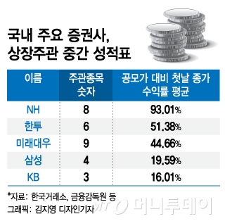 신규상장 종목 첫 날 종가 기준, NH증권 주관 8개사 상승률 93%로 최고... 한투·미래대우·삼성·KB 순