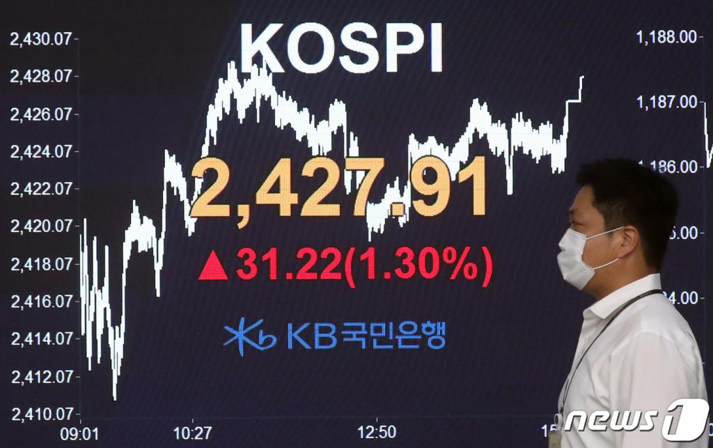 14일 코스피는 31.22포인트(1.3%) 오른 2427.91로 마감했다. 2400선을 돌파한 것은 이달 8일 이후 4거래일 만이다. 올해 최고치인 2437.53(지난달 13일, 종가 기준)에도 10p 차이로 다가섰다.