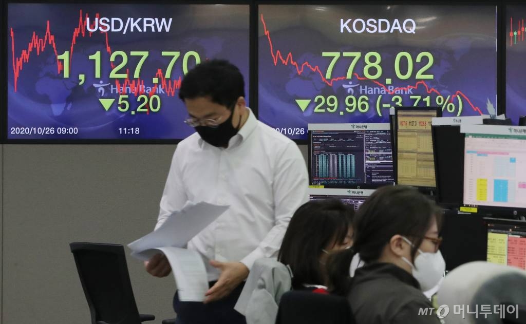 ![[서울=뉴시스] 박미소 기자 = 코스닥이 전 거래일(807.98)보다 29.96포인트(3.71%) 내린 778.02에 마감한 26일 오후 서울 중구 하나은행 딜링룸에서 직원들이 업무를 보고 있다. 이날 코스피 지수는 전 거래일(2360.81)보다 16.90포인트(0.72%) 내린 2343.91에, 서울 외환시장에서 원·달러 환율은 전 거래일(1132.9원)보다 5.2원 내린 1127.7원에 마감했다. 2020.10.26. misocamera@newsis.com](https://thumb.mt.co.kr/cdn-cgi/image/f=avif/21/2020/10/2020102616015251102_1.jpg)