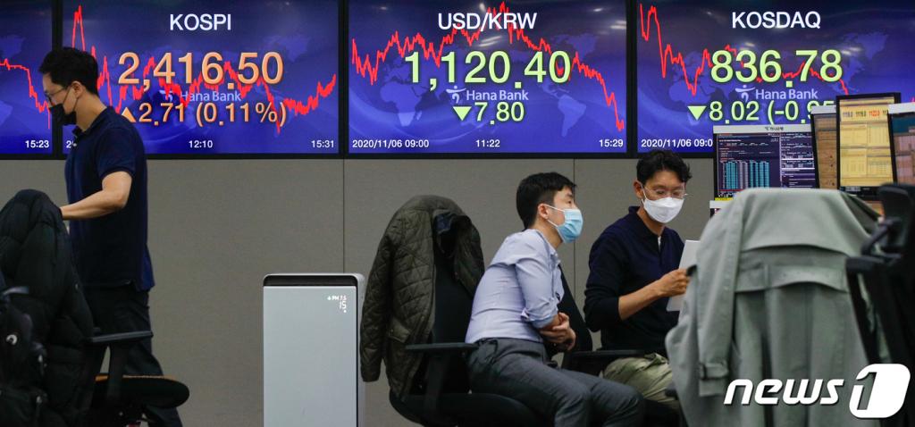 미국 대선 개표가 막바지에 다다른 6일, 상승 곡선을 그리던 코스피가 멈춰섰다. 전날까지 나흘 연속 오르며 2410선에 도달한 코스피는 이날 0.1% 상승으로 마감했다. 개인은 이날까지 5거래일 연속 순매도를 기록했다.