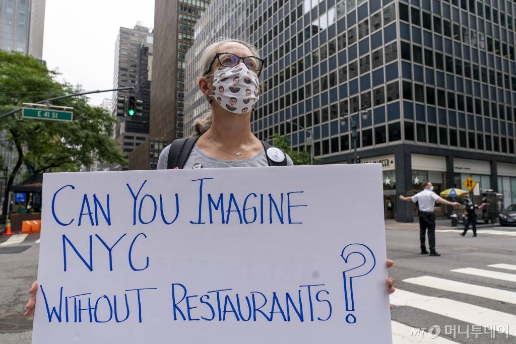 ![[뉴욕=AP/뉴시스]28일(현지시간) 미국 뉴욕에 있는 앤드루 쿠오모 주지사 집무실 건물 앞에서 요식 업소 주인과 직원들이 코로나19 규제 완화 요구 시위를 벌이고 있다. 이들은 야외 회식을 확대하고 실내 식사 인원을 현재 25%에서 50%까지 확대해 줄 것을 요구하고 있다. 2020.09.29.](https://thumb.mt.co.kr/cdn-cgi/image/f=avif/21/2020/11/2020111307013519806_2.jpg)