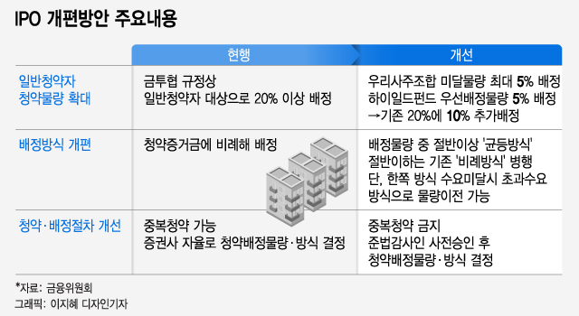 이에 일반청약자 배정물량 중 절반 이상은 '균등방식'을, 현행 청약증거금 기준 '비례방식'은 절반 이하로 낮춰 병행키로 했다.