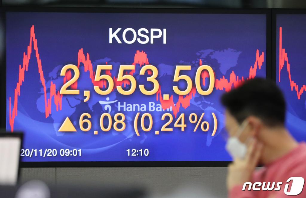 20일 코스피지수는 전 거래일 대비 6.08포인트(0.24%) 오른 2553.50에 마감하며 사흘 연속 종가 기준 연고점을 경신했다.