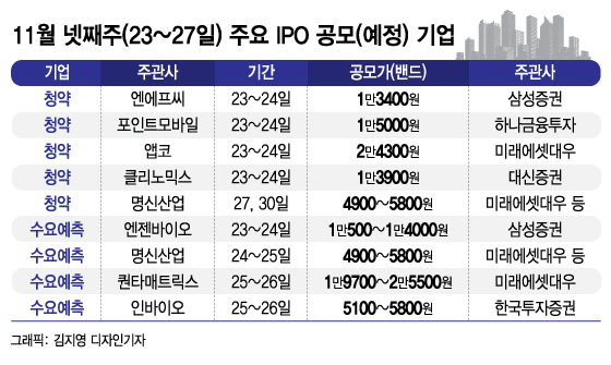 11월 넷째주 IPO 시장에선 같은 날(23~24일) 4개 기업이 동시에 청약을 받는다. 모두 수요예측에 흥행한 기업으로 청약 흥행 성과에 관심이 집중된다.