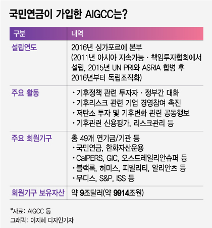 국민연금 관계자는 "이번 AIGCC는 수탁자 책임활동 로드맵에 따른 것"이라고 했다. 국민연금기금 운용지침은 국민연금이 ESG(환경 사회 지배구조) 등 비재무적 요소를 고려한 투자를 진행함과 동시에 ESG 공시 개선을 유도하고 관련제도 개선 건의, 관련 거래기관의 ESG 정보활용 유도 등을 추진하도록 규정하고 있다.
