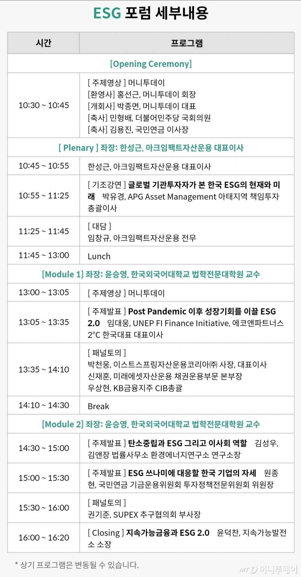 이에 이번 ESG 포럼에 글로벌 기관투자자와 국내 전문가, 기업, 금융권 관계자분들을 모시고 중장기 한국 경제 시스템 개편에 ESG가 어떤 역할을 할 수 있을 것인지 지혜를 모으고자 합니다. 정책 입안자, 기업 경영자, 기관 투자자들에게 특히 의미있는 행사가 될 것으로 기대됩니다.