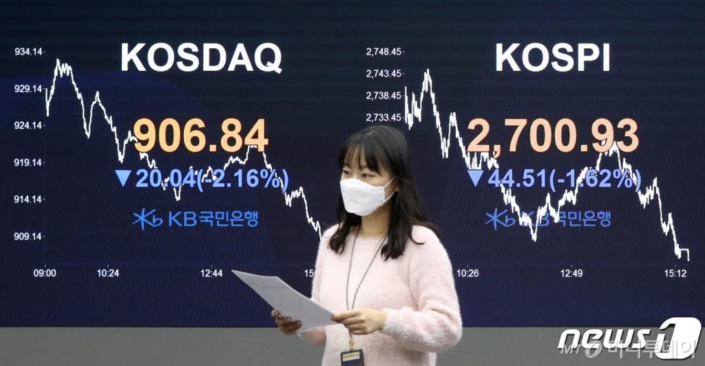 8일 코스피 지수는 전일대비 44.51포인트(1.62%) 떨어진 2700.93에 장을 마쳤다. 이달 들어 가파르게 역사적 고점을 높여오던 코스피 지수가 한 방에 주저 앉아 2700선에 턱걸이했다.