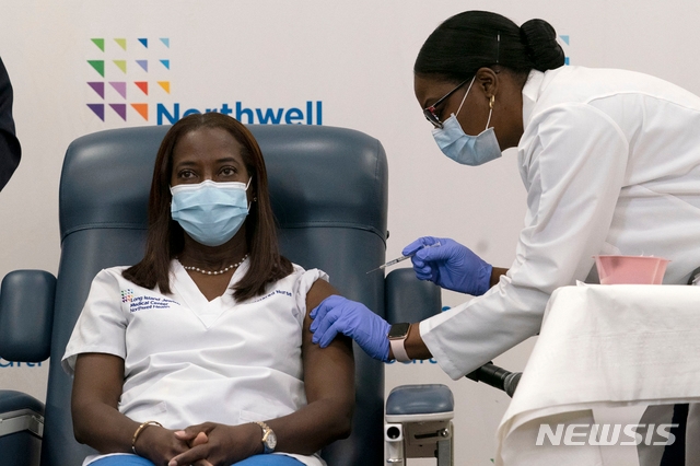 ![[퀸스=AP/뉴시스] 14일(현지시간) 뉴욕 퀸스의 중환자실 간호사 샌드라 린지가 미국에서 최초로 신종 코로나바이러스 감염증(코로나19) 백신을 맞고 있다. 린지는 "희망과 안도를 느낀다"며 "나는 (백신이) 이 고통스러운 시간을 마칠 시작점이길 바란다"고 소감을 밝혔다. 2020.12.15.](https://thumb.mt.co.kr/cdn-cgi/image/f=avif/21/2020/12/2020121501501279275_1.jpg)