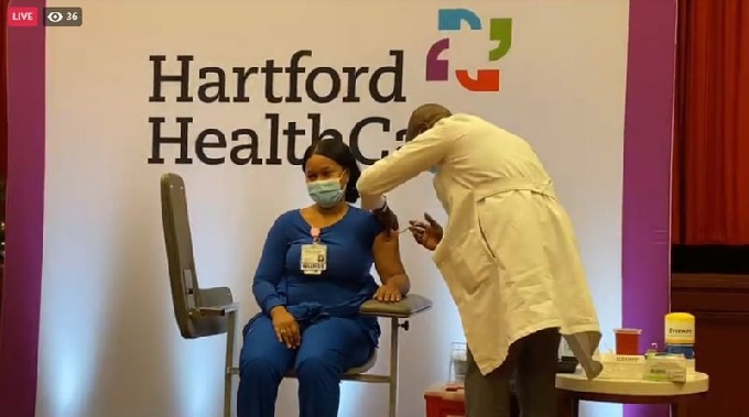 21일(현지시간) AFP통신과 지역 일간지 하트퍼드커런트에 따르면 현지 하트퍼드 병원의 중환자실 간호사인 맨디 델가도가 이날 오전 11시40분쯤 처음으로 모더나 백신을 팔에 맞았다.