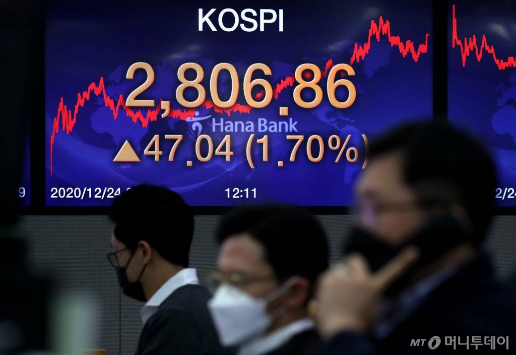 24일 코스피는 전날보다 47.04포인트(1.70%) 오른 2806.86으로 거래를 마쳤다. 코스피 역사상 처음으로 2800선을 넘었다. 장중 최고치는 2812.16이었다. 올해 3월 최저치(1439.43)에 비하면 2배 가까이 상승한 것이다.