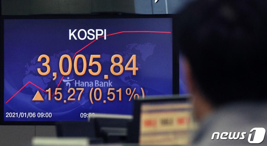 6일 코스피지수는 전 거래일 대비 22.36포인트(0.75%) 내린 2968.21로 마감했다. 이날 코스피는 장중 3027.16까지 올라 사상 처음으로 3000선을 돌파했다. 이는 2007년 7월 25일 2000선을 최초로 돌파한 지 약 13년 6개월 만이다.