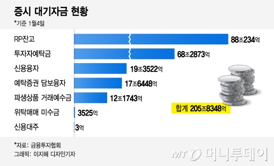 개미들의 투자여력은 충분하다 못해 넘쳐 흐른다. 금융투자협회에 따르면 증시 대기자금은 205조원을 넘어서며 사상 최고치를 갈아치웠다. 지난 4일 기준 △투자자예탁금(68조2873억원) △파생상품 거래에수금(12조1743억원) △RP(환매조건부채권) 잔고(88조234억원) △예탁증권 담보융자(17조6448억원) △신용융자 잔고(19조3522억원) 등 총 205조8348억원에 달했다.