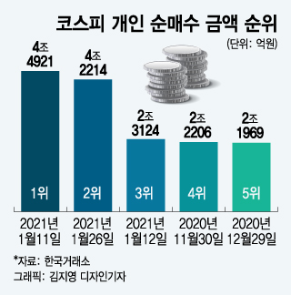 이날 개인 순매수 금액은 이달 11일에 이어 코스피 역사상 두 번째로 많았다. 기존 2위였던 1월12일(2조3124억원)과 2조원 가까이 많을 정도로 큰 차이다.