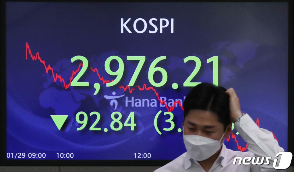 29일 코스피 지수는 전 거래일 대비 92.84포인트(3.03%) 급락한 2976.21로 마감했다. 코스피 지수는 장중 한때 4% 넘게 하락하며 2962.7까지 떨어졌다.