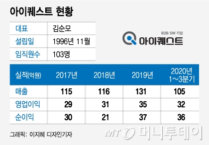 아이퀘스트는 지난해 3분기까지 105억원 매출액에 32억원의 영업이익과 36억원의 순이익을 기록했다. 영업이익률이 30%가 넘을 수 있는 배경은 원가구조에 있다.