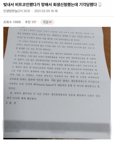 최근 투자 관련 온라인 커뮤니티에는 "빚 내서 비트코인 했다가 망해서 회생신청했는데 기각당했다"는 글과 함께 판결문 사진이 올라왔다.
