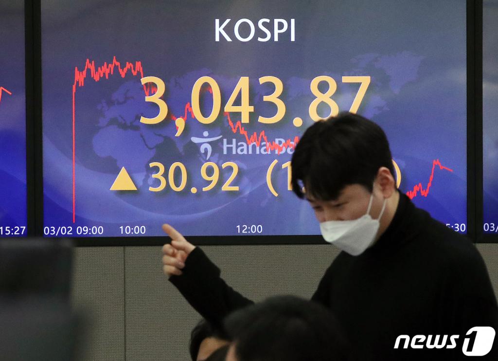 2일 코스피는 전 거래일 대비 30.92포인트(1.03%) 오른 3043.87로 마감했다. 이날 3021.68에 출발한 코스피는 장중 3096.50(2.77%)까지 뛰어오르며 상승폭을 키웠다.