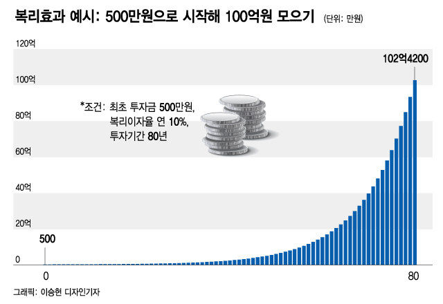 우리도 얼마든지 버핏의 투자 법칙을 실천해 복리효과를 누릴 수 있다. 예컨대 바야흐로 100세 시대이니까, 나이 20살에 500만원으로 투자를 시작해 연복리 10%의 수익률로 80년간 꾸준히 투자를 한다면, 100억원을 모으는 게 전혀 불가능하지 않다. 우리의 투자금은 10년, 20년 후엔 1300만원, 3300만원으로 불어나지만 시간이 갈수록 증가 속도가 점점 빨라지면서 55년 후엔 10억원을 넘어서고 67년 이후엔 30억원, 그리고 72년 후엔 50억원을 초과하게 된다. 79년 후엔 최초 500만원의 투자금이 100억원으로 불어난다.