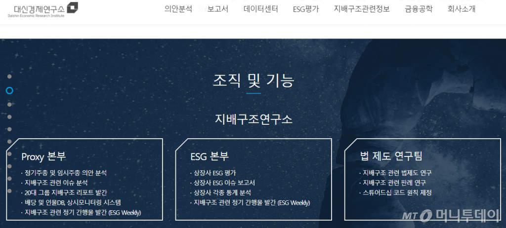 1984년 설립된 대신경제연구소는 산하에 지배구조연구소, 금융공학연구소를 두고 있다. 이곳의 지배구조연구소는 정기·임시 주총 의안분석은 물론이고 국내 주요 20대 그룹의 지배구조 리포트, 상장사 ESG(환경 사회 지배구조) 이슈보고서 등을 발간하는 기관이다. 조윤남 전 대신증권 리서치센터장이 2019년부터 대표이사로 취임했다.