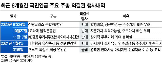수책위는 지난해 10월 LG화학의 배터리 부문 물적분할 안건과 올 1월 대한항공의 유상증자를 위한 정관 개정 안건 등에 대해 반대 의결권을 행사했다. 이달 들어 포스코의 최정우 회장 연임 안건에 대해서는 중립 입장을 냈다.