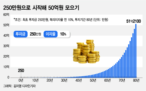 250만원으로 시작해서 50억원을 모을 수 있다는 말에 눈이 동그라진 딸에게 필자는 시간이 흐를수록 투자액이 기하급수적으로 증가하는 복리효과를 설명했습니다. 예컨대 250만원을 투자해서 연복리 10%의 수익률을 얻는다면 79년 후엔 50억원으로 불어나는 예시를 보여줬습니다.